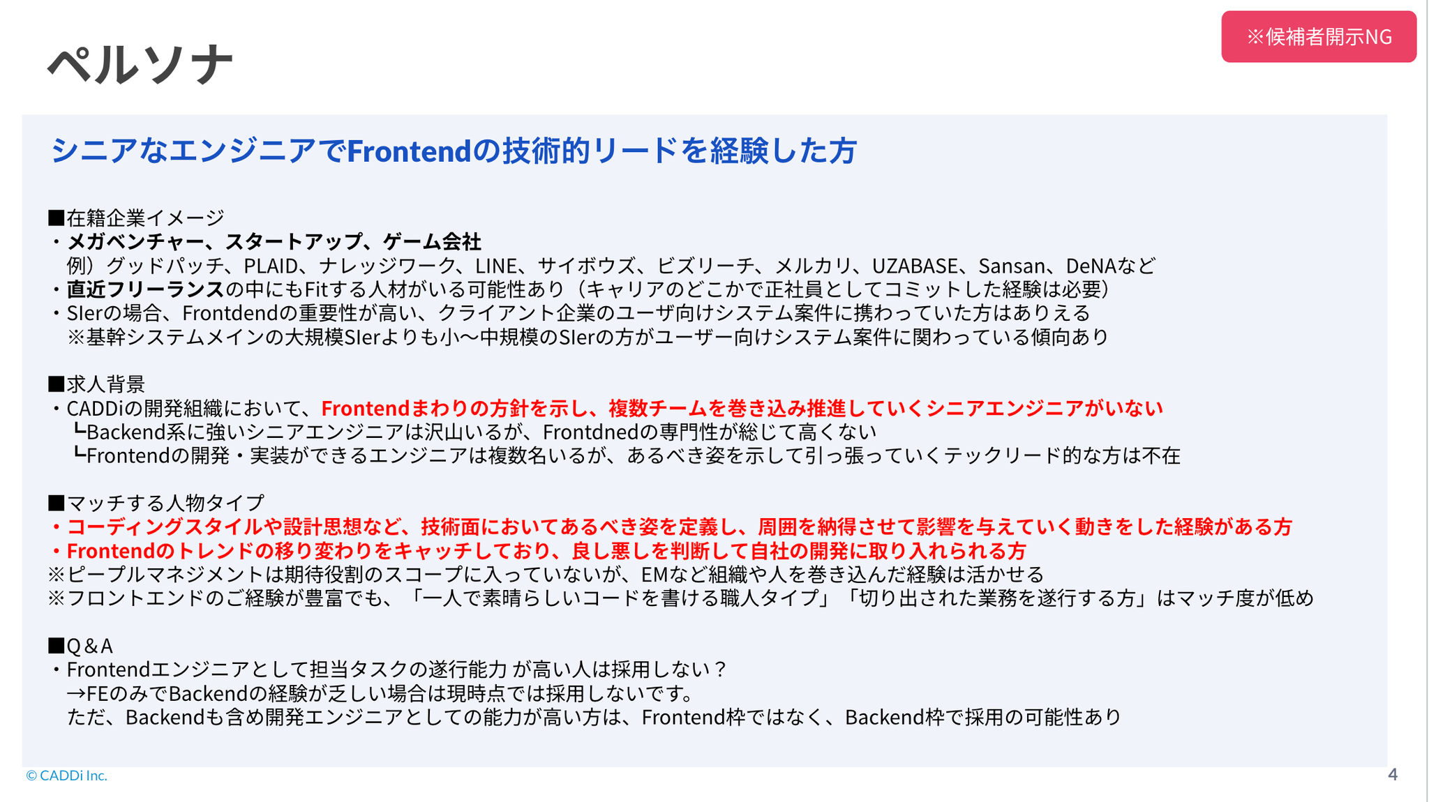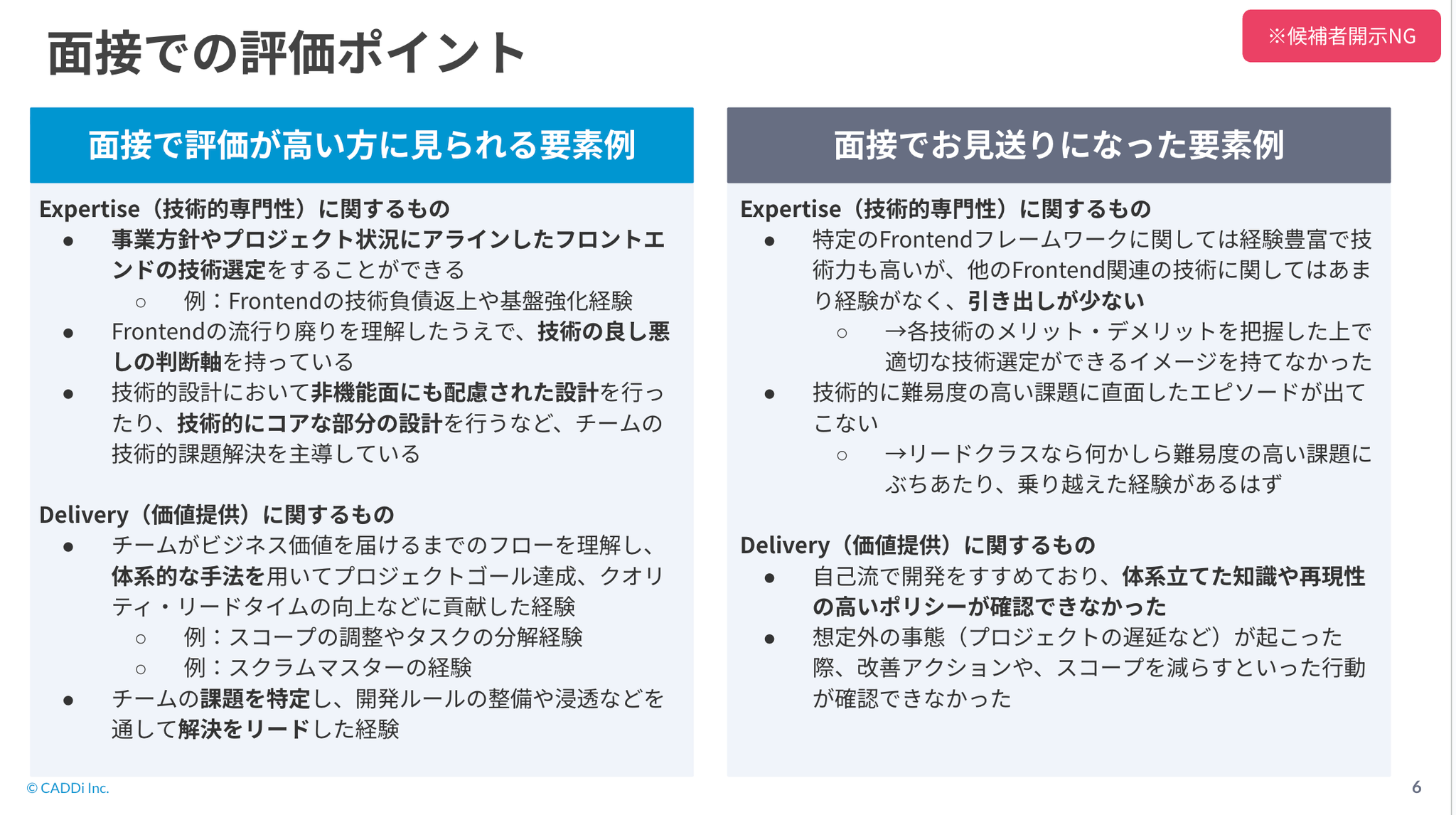 ・Hard Skills:Frontendに関する技術要素について、どの分野の質問をしても自分のスタンスを持っている。また、それを相手に合わせて抽象度を調整しながら分かりやすく説明できる。技術選定においても、流行に流されるだけでなく プロダクトの特性や人材のケイパビリティを鑑みて意思決定をしていた。