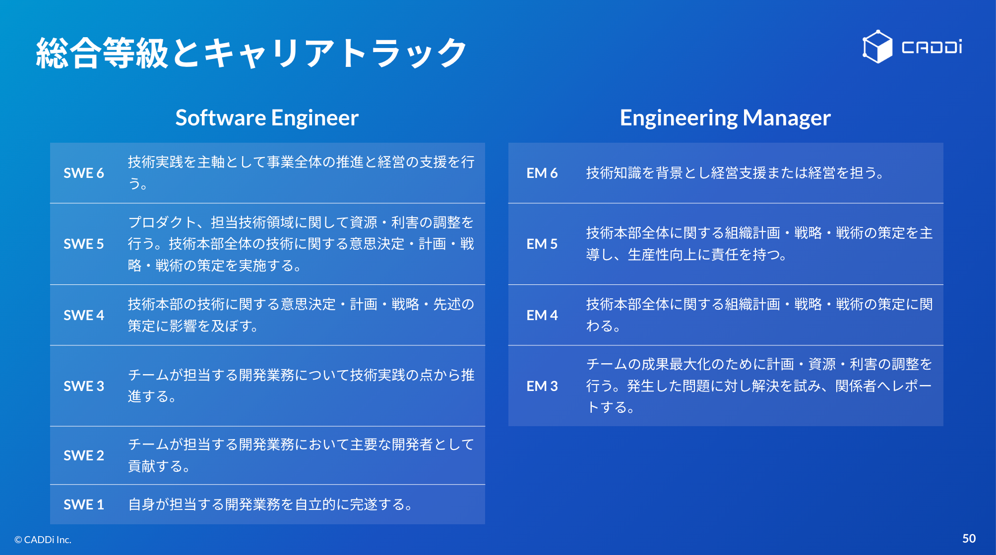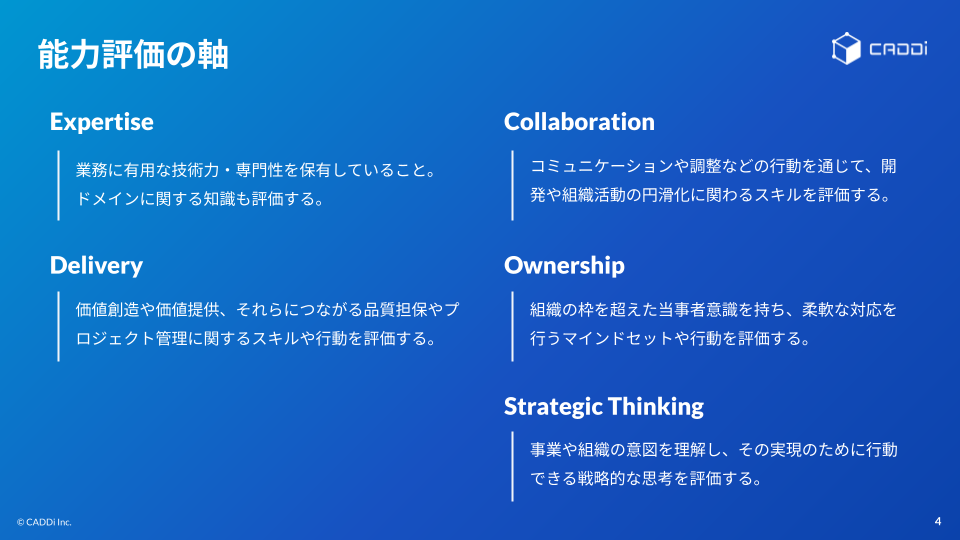 キャディの選考では、社内で使用しているエンジニア評価の考え方と全く同じ基準で評価を実施します。