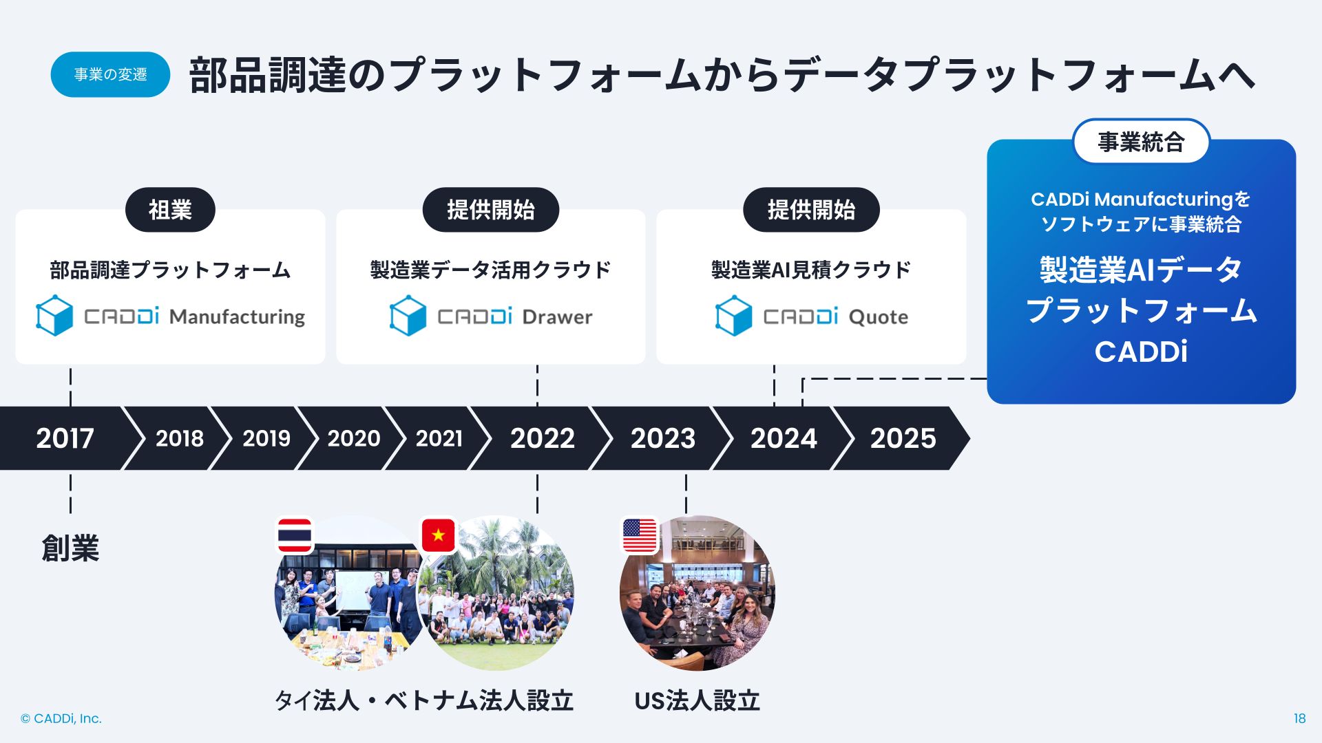 キャディは2024年7月に祖業であるCADDi Manufacturingをクローズし、製造業AIデータプラットフォームとしてソフトウェアの事業を開始しました。