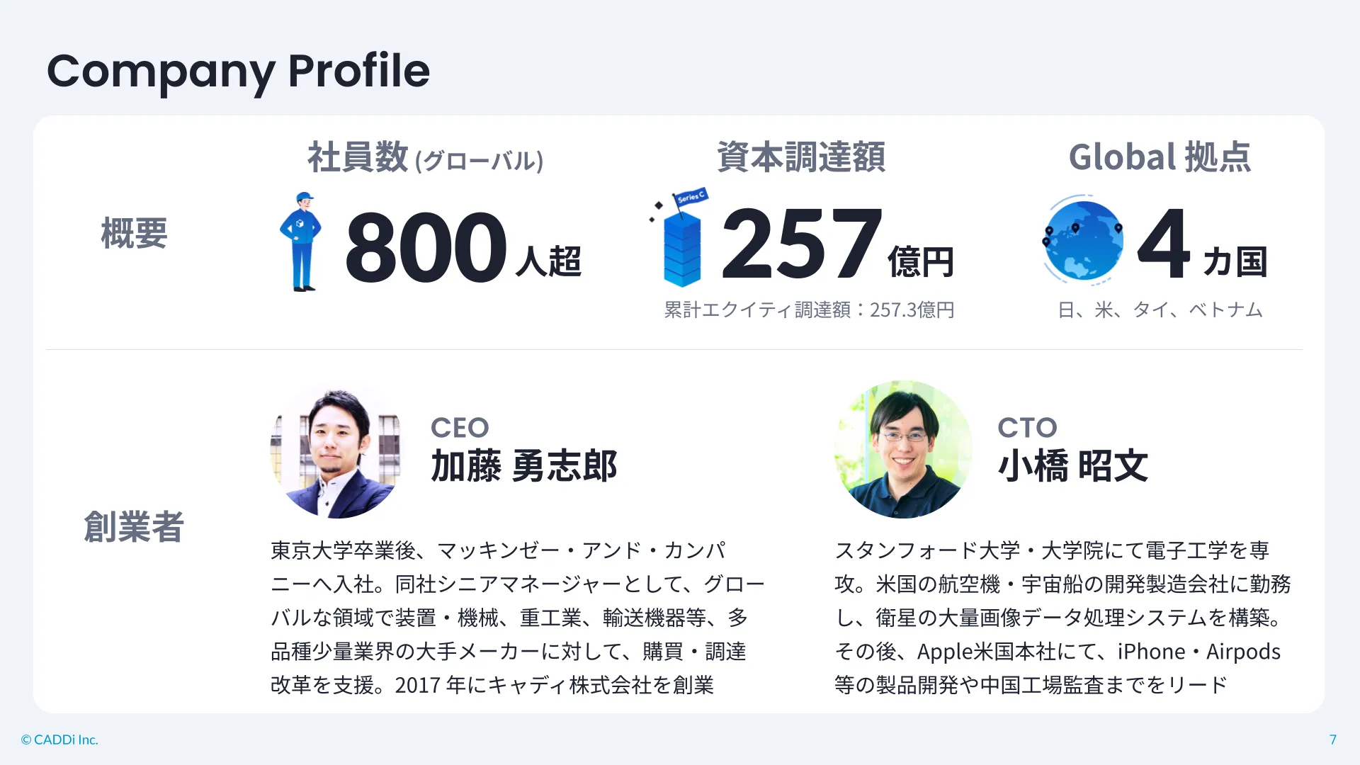 - CEO加藤とCTO小橋の2人で共同創業されたキャディは、3D図面の自動見積もりサービスから事業をスタート。